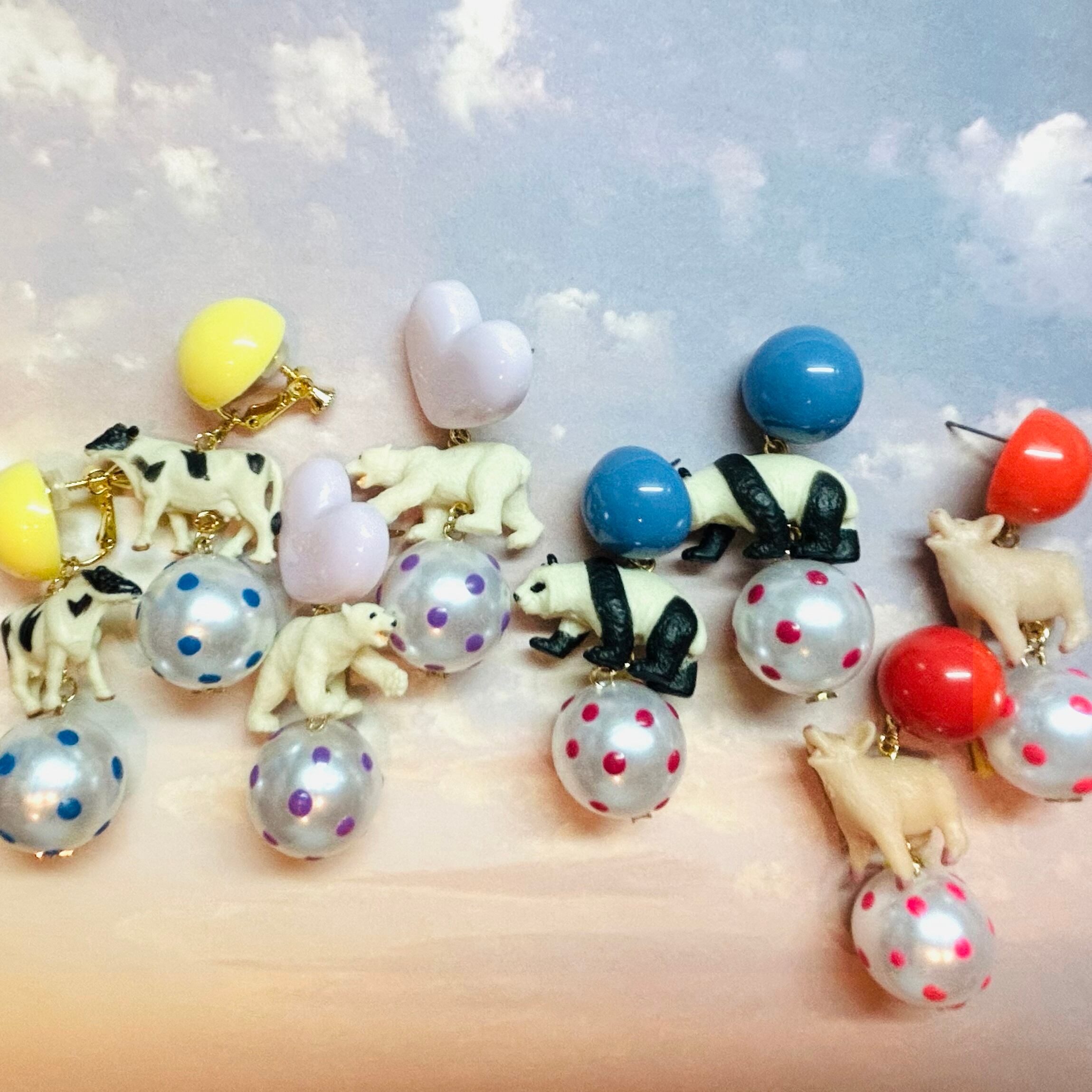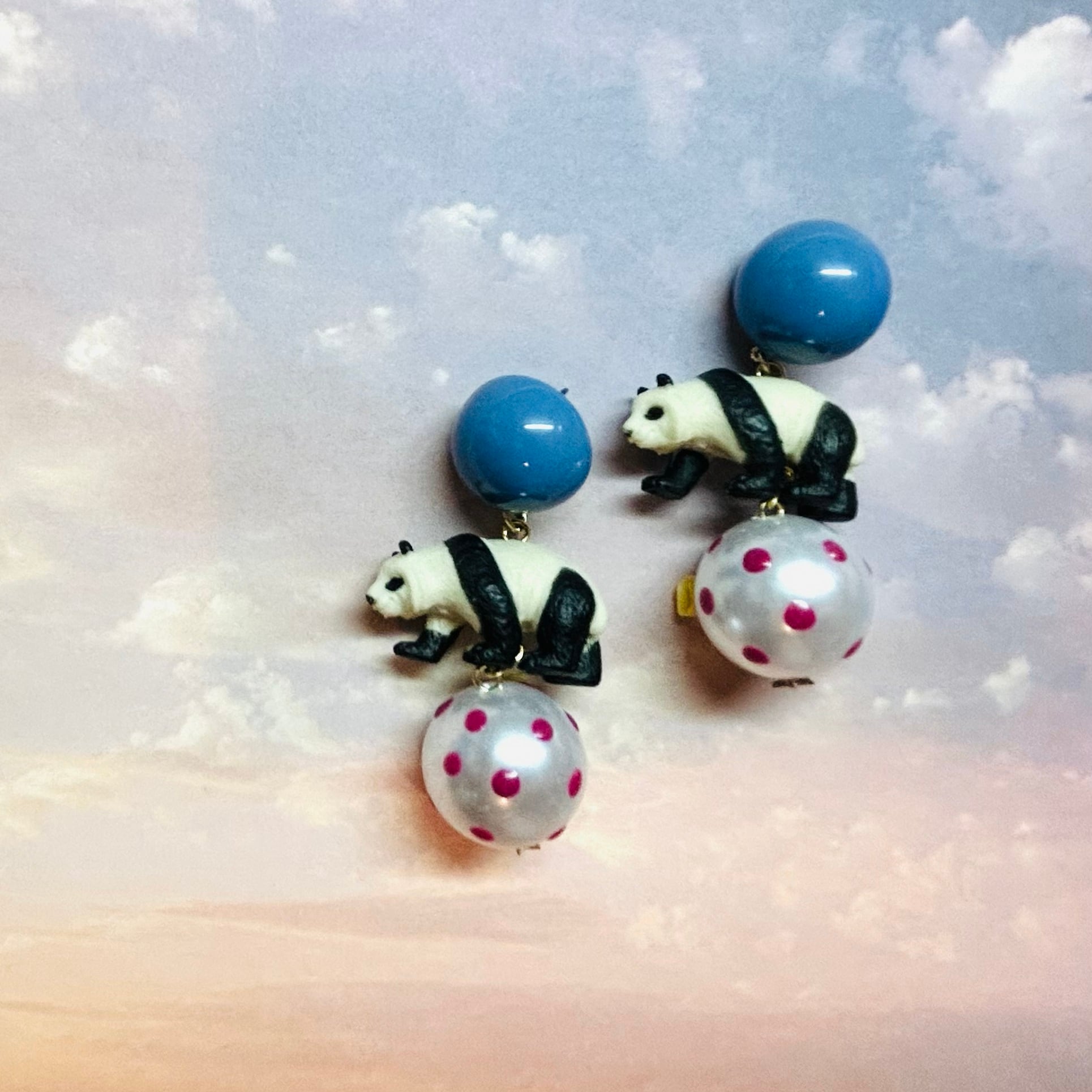 丸型の樹脂カボションに水玉パールに乗ったパンダちゃんのピアス♡