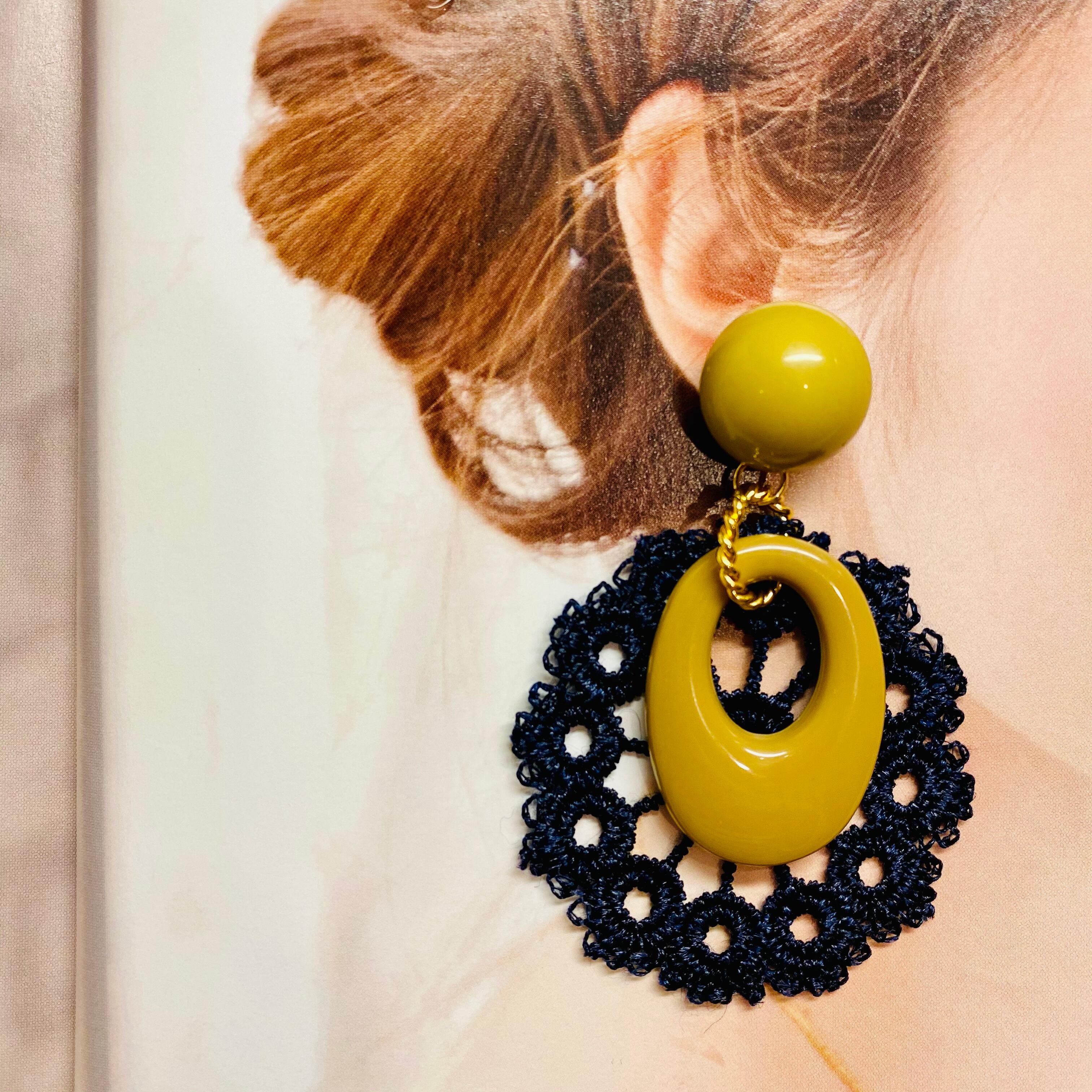 マスタードカラーの樹脂パーツとネイビーのレース組み合わせた大人ピアス♡
