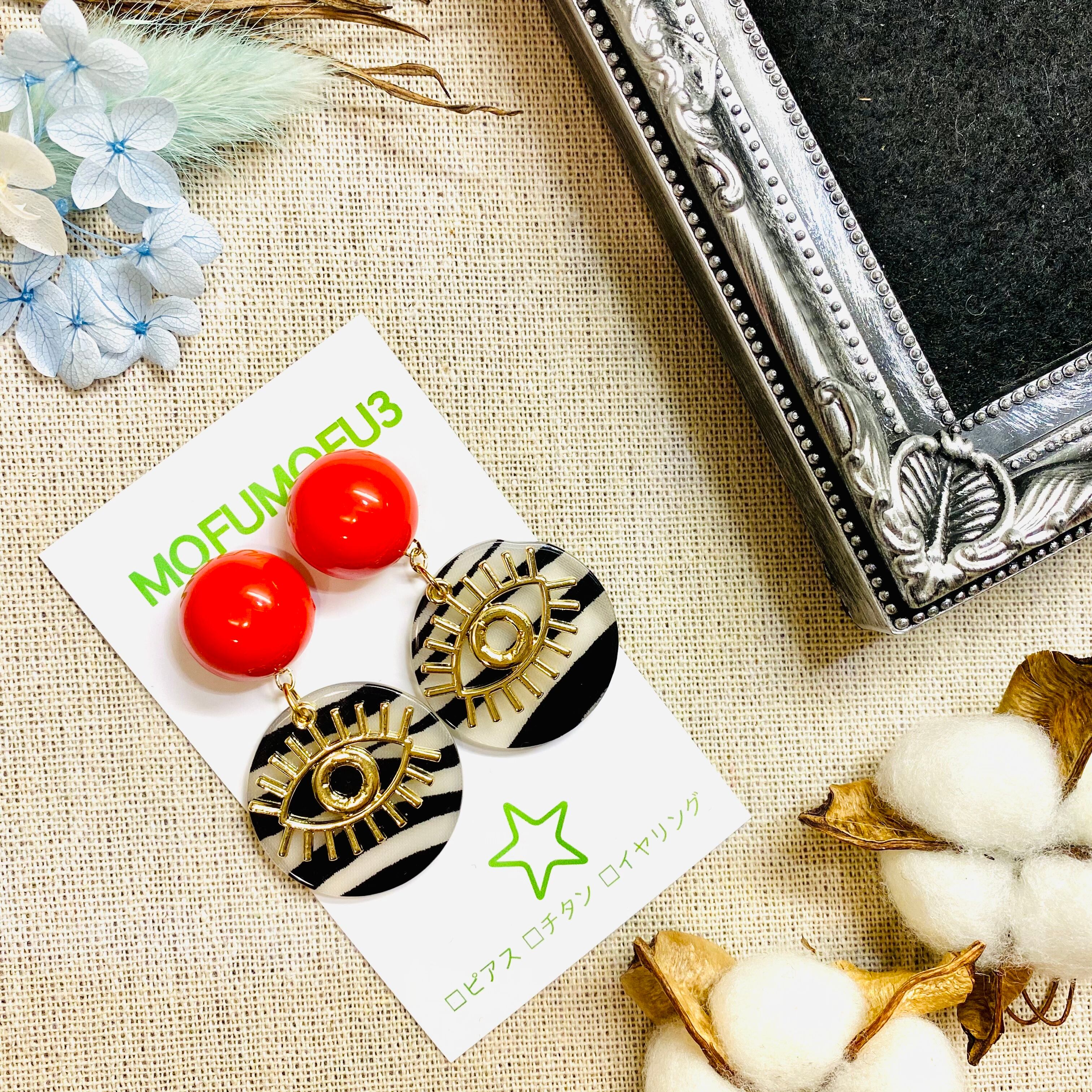 赤とゼブラ柄の樹脂パーツにおめだまパーツを組み合わせたピアス♡