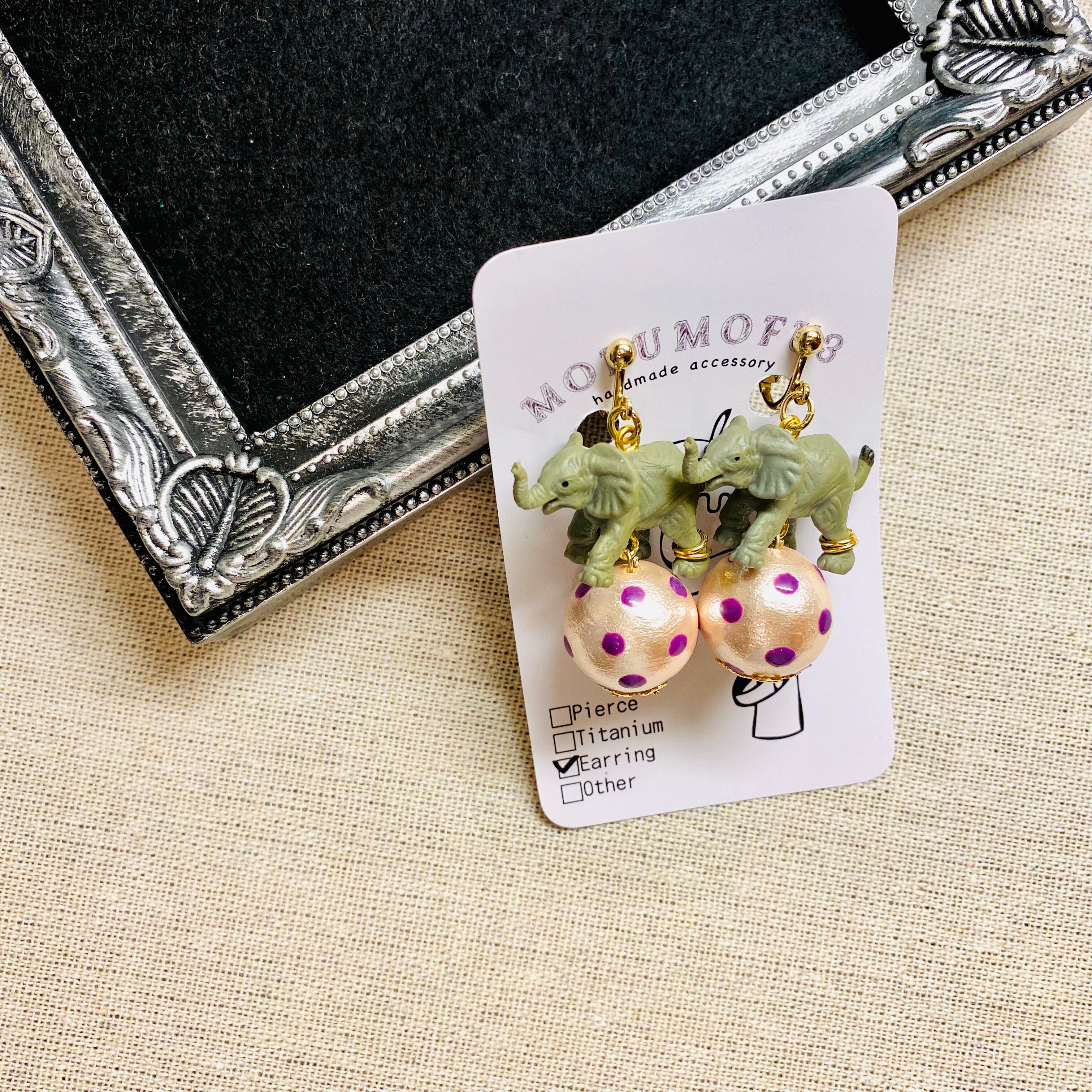手書きのドット柄のコットンパールとゾウのチャームを組み合わせたイヤリング♡