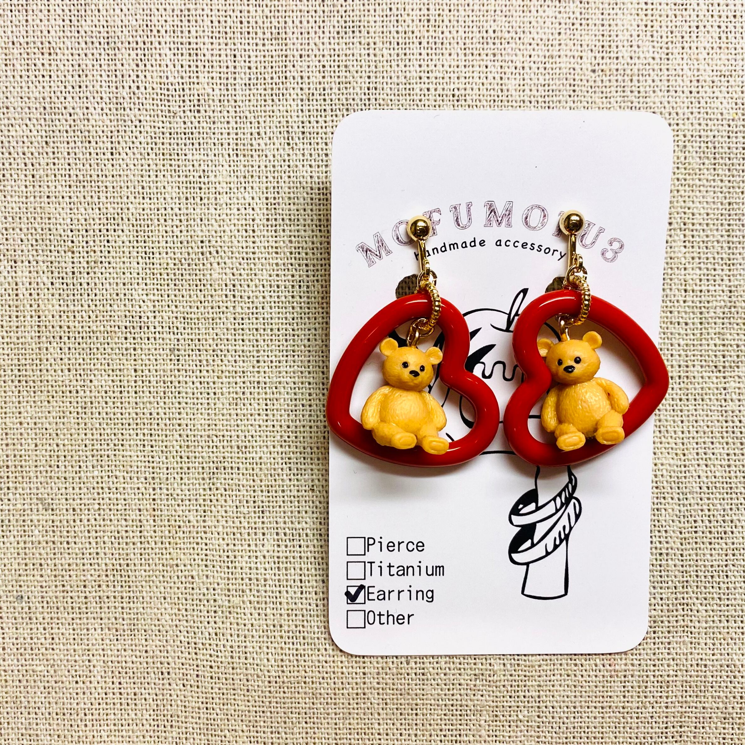 可愛らしいクマちゃんとハート型のフレームを組み合わせたイヤリング♡