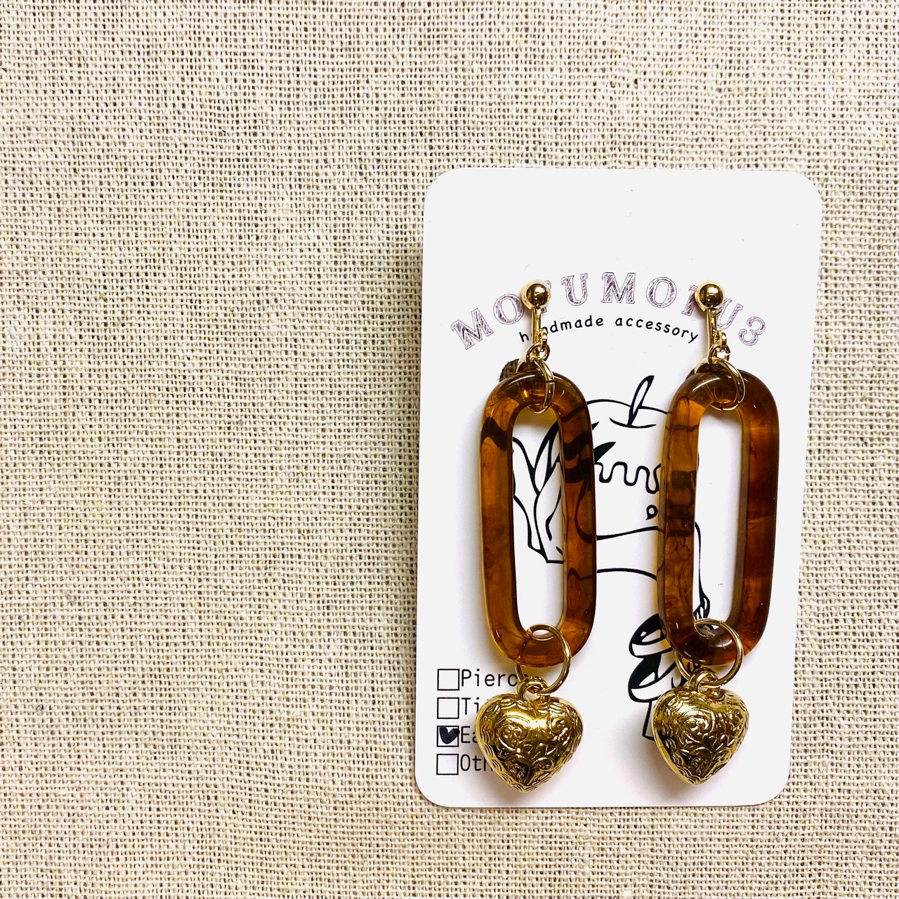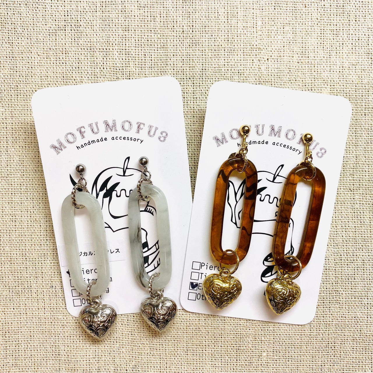 樹脂のフレームにハートのチャームを組み合わせたイヤリング♡