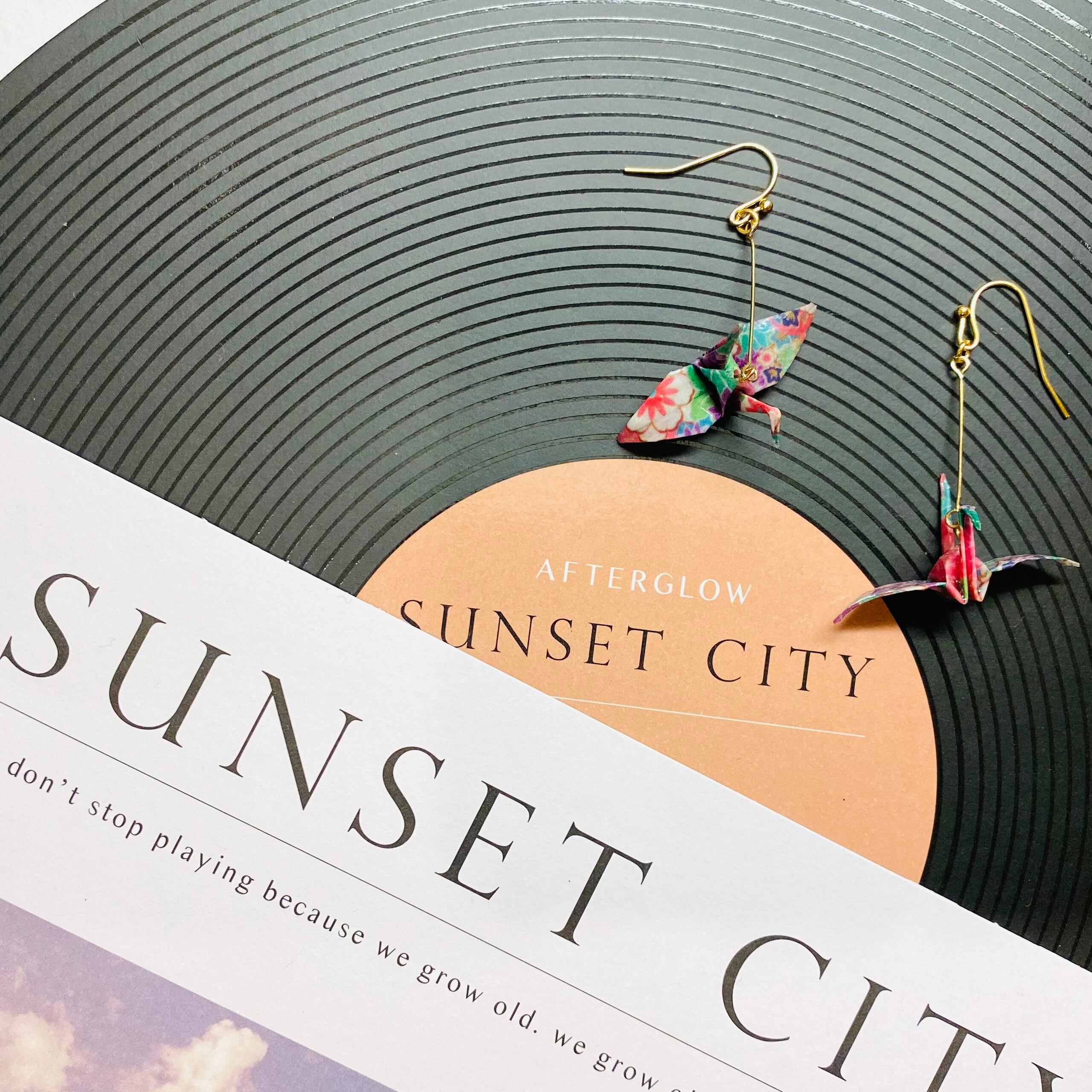 和柄の折り鶴を樹脂でコーティングしたピアス♡