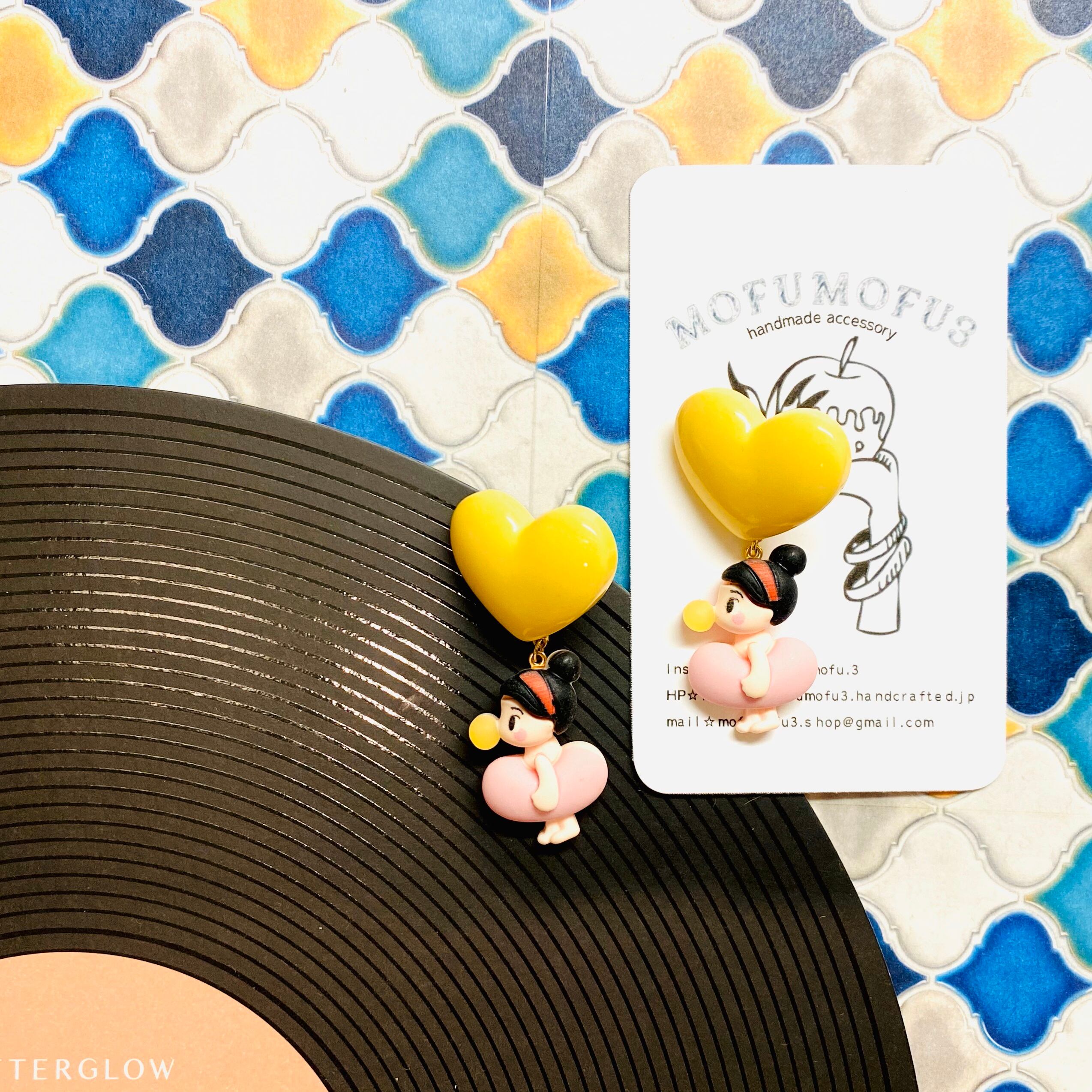 ハート型の樹脂カボションとうきわを持った女の子の樹脂パーツを組み合わせた可愛らしいピアス♡