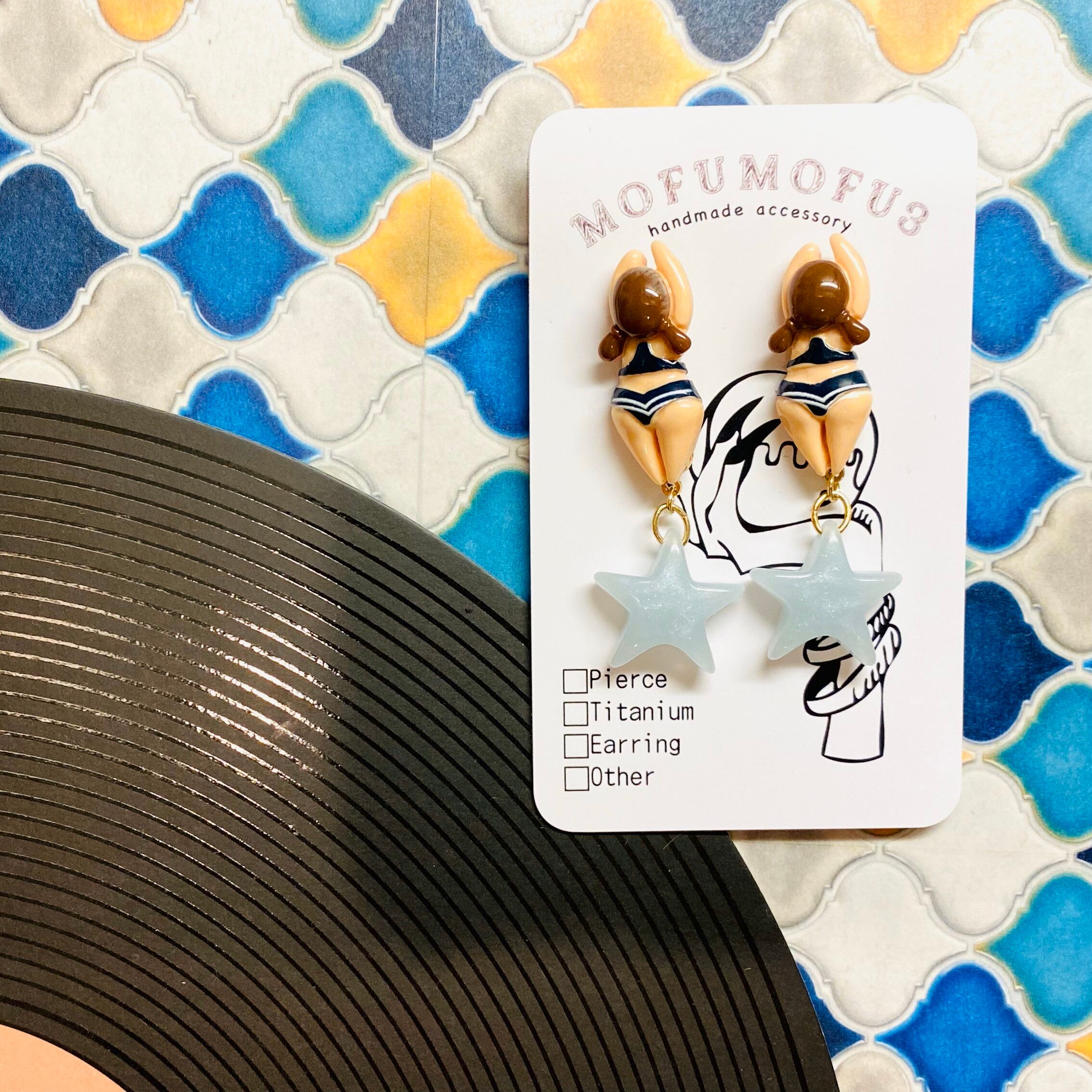 樹脂カボションと涼し気なカラーの星パーツを組み合わせた可愛らしいピアス♡