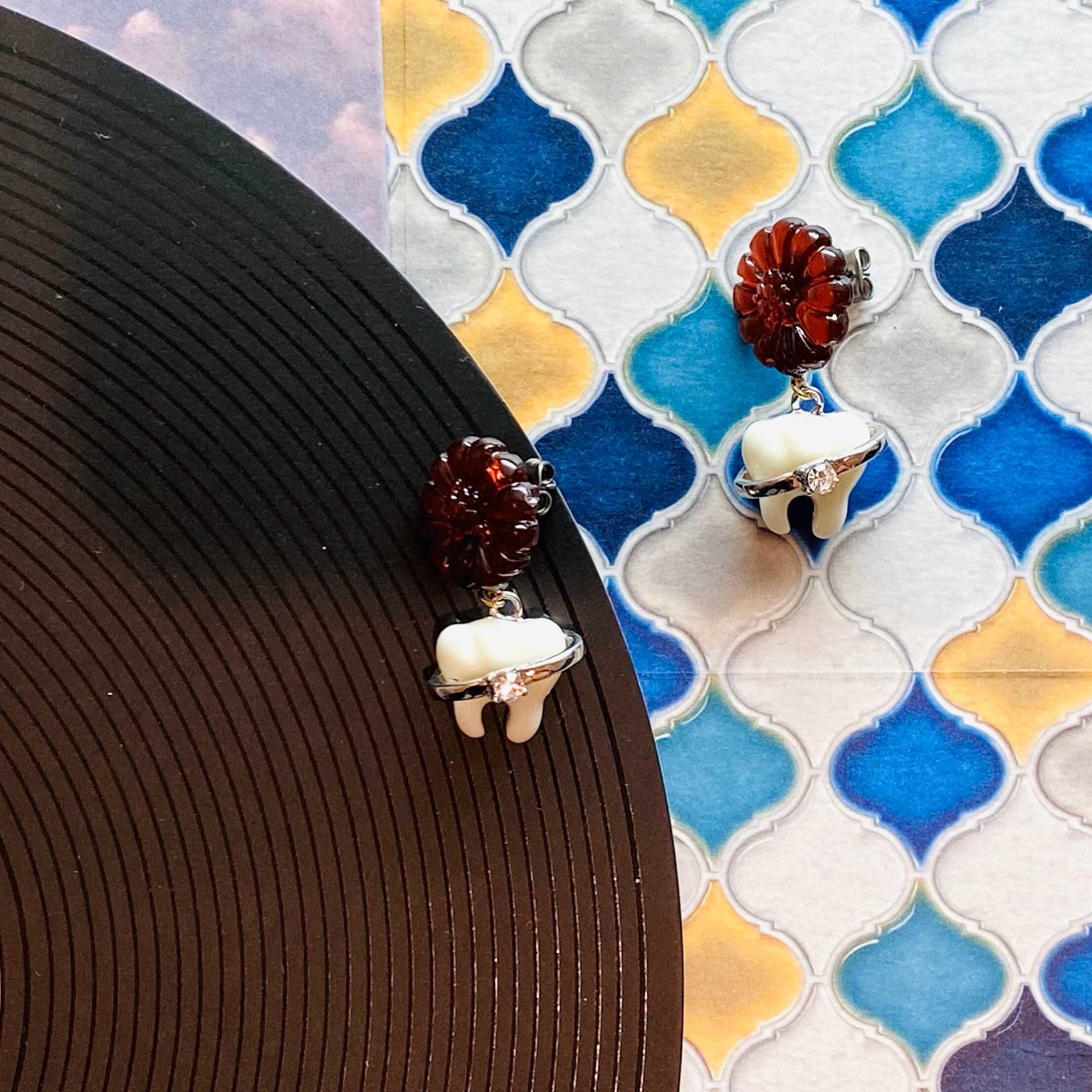 樹脂製のクリアの花形カボションと矯正しているかのような歯のチャームを組み合わせたちょっぴり個性的なピアス♡
