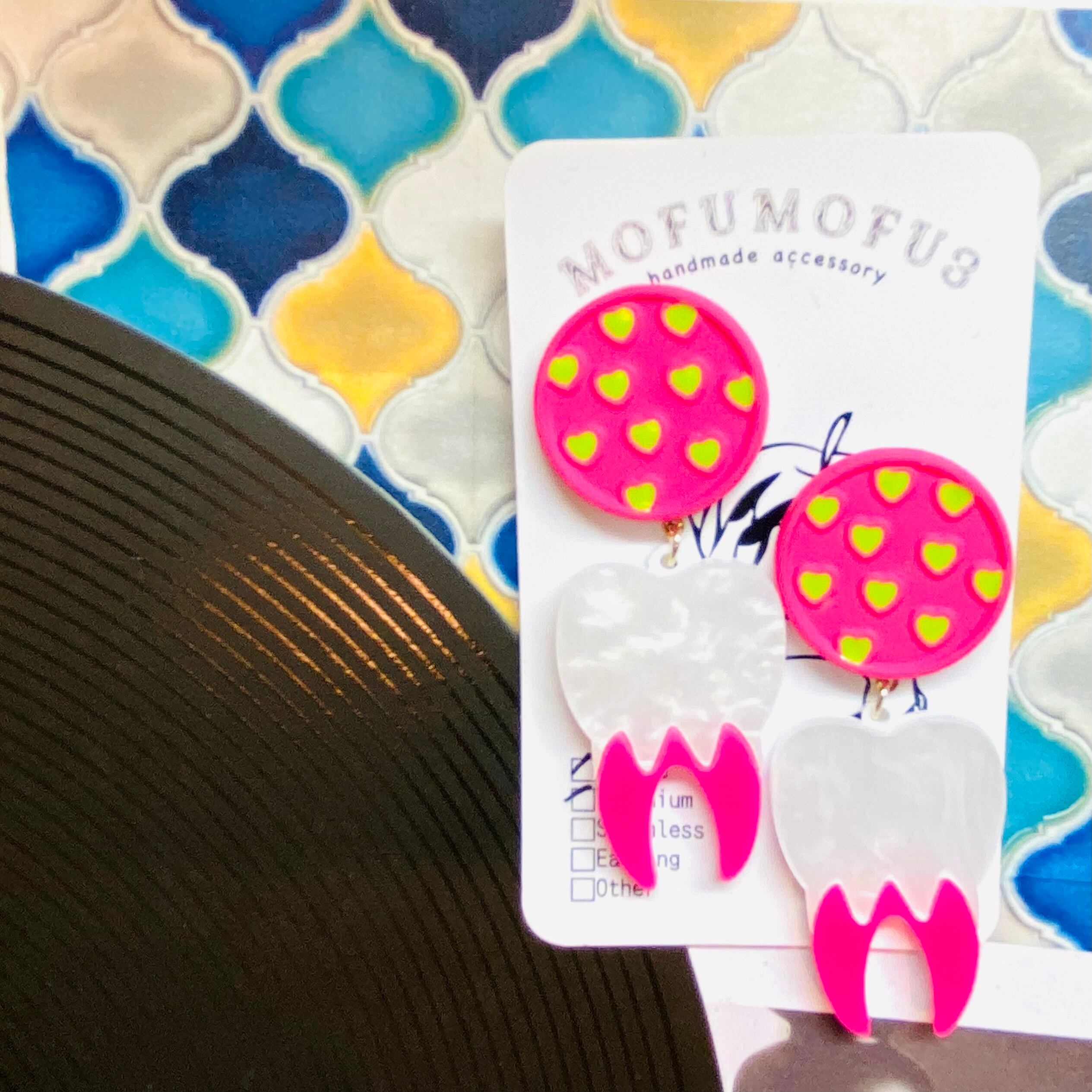 ドット柄の樹脂カボションに歯のチャームを組み合わせたピアス♡